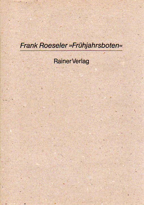 Roeseler, Frank: Frühjahrsboten. Auflage: 120 nummerierte und signierte Exemplare. Berlin. Rainer Verlag. 1992. 30 x 21 cm. 44 unpaginierte S. OKarton. Sehr gutes Exemplar. Im Impressum handschriftlich nummeriertes und von Frank Roeseler signiertes Exemplar, hier die Nummer 15 von 120. Durchgehend mit ganzseitigen Abbildungen versehen.