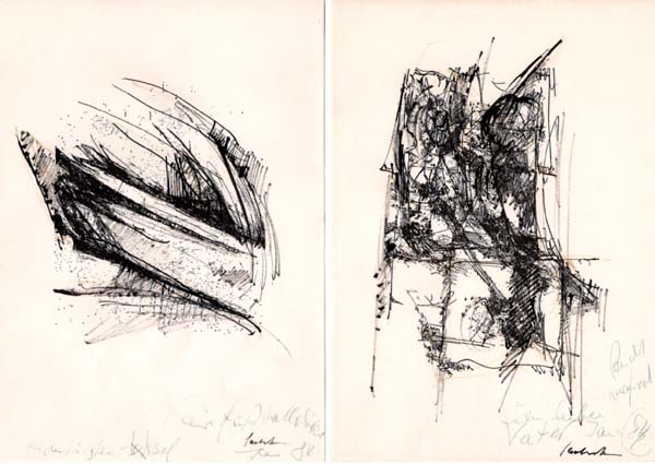 Sackenheim, Rolf: Abstrakte Kompositionen. 2 Blatt. Gutes bis sehr gutes Exemplar. 2 Zeichnungen, Tusche und Feder, 29,8 x 21 cm. Jeweils in Bleistift mit Widmungen versehen, datiert 1984, in Tinte signiert.