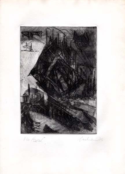 Sackenheim, Rolf: Ohne Titel. Radierung. Düsseldorf. Städtische Kunsthalle Düsseldorf. 1972. Papier minimal nachgedunkelt, sonst sehr gutes Exemplar. Kaltnadelradierung auf Bütten, 22,5 x 16,0 cm (Blatt 38 x 26,5 cm), signiert und datiert 1983. Abstrahierte Stadtszene.