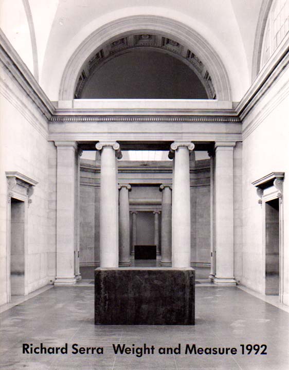 Serra, Richard: Weight and Measure 1992. Tate Gallery, London, 30 September 1992-15 January 1993. Erste Auflage. London. Tate Gallery. 1992. 27 x 22 cm. 111 S. OKarton mit OKlappenumschlag. Papier leicht lichtrandig. Bleistiftanstreichungen und Notizen auf mehreren Seiten, sonst noch gutes Exemplar. Texte in Deutsch und Englisch. Enthält ein Interview von Nicholas Serota und David Sylvester mit Richard Serra, Vorwort von Nicholas Serota.