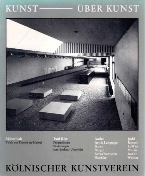 Kunst – Über Kunst. Werke und Theorien eine Ausstellung in drei Teilen. Teil I: Kasimir Malewitsch, Tafeln zur Theorie der Malerei. Teil II: Paul Klee: Progressionen, bearbeitet von Christian Geelhaar. Teil III: nach 1965, in Zusammenarbeit mit Paul Maenz. Andre, Art & Language, Buren, Burgin, Burn / Ramsden, Huebler, Judd, Kosuth, LeWitt, Morris, Roehr, Weiner. Kölnischer Kunstverein, 11. April bis 26. Mai 1974. Erste Auflage. Köln. Kölnischer Kunstverein. 1974. 27 x 22 cm. 129 S., 6 Blatt mit Anzeigen. Illustrierter OKarton. Rücken auf die Deckel übergehend ausgeblichen. Innen papierbedingt nachgedunkelt. Ordentliches Exemplar. Durchgehend mit meist ganzseitigen schwarzweißen Abbildungen versehen. Auflage: 1500 Exemplare.