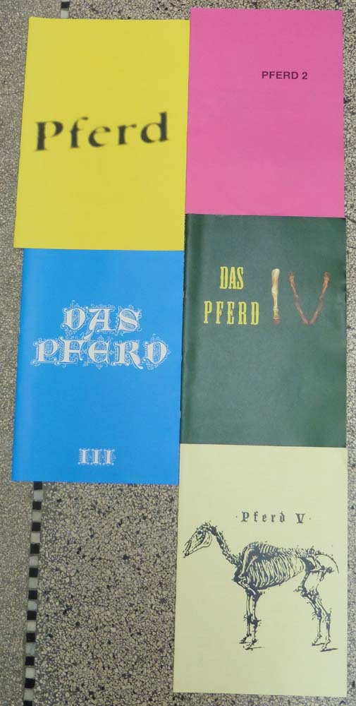 Das Pferd. [Rundgang Klasse Immendorff 2004-2008]. 1. Auflage. 5 Bände. Düsseldorf. Staatliche Kunstakademie Düsseldorf. 2004-2008. 42 x 3 cm. 35; 38; 55; 43; 48 S. OBroschur. Gutes bis sehr gutes Exemplar. Vollständige Folge aller 5 Bände des Künstlermagazin „Das Pferd“ der Klasse Immendorff. Erschienen von 2004 bis 2008 anläßlich der Rundgänge in der Kunstakademie Düsseldorf. Enthält zahlreiche Beiträge der Studierenden. Durchgehend mit meist farbigen Abbildungen versehen.