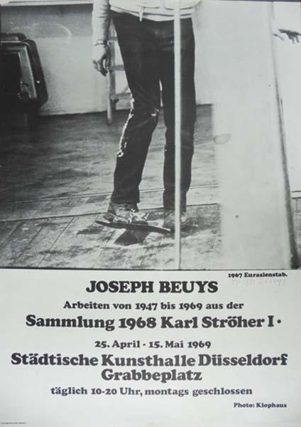 Beuys, Joseph: Arbeiten von 1947 bis 1969 aus der Sammlung 1968 Karl Ströher I. [Plakat] Städtische Kunsthalle Düsseldorf, 25. April – 15. Mai 1969. Düsseldorf. Städtische Kunsthalle. 1969. 84 x 59 cm. 1 Blatt. Sehr gutes Exemplar. Plakat mit einem Foto von Ute Klophaus aus „1967 Eurasienstab“. Von Joseph Beuys in Bleistift unter dem Foto rechts signiert.