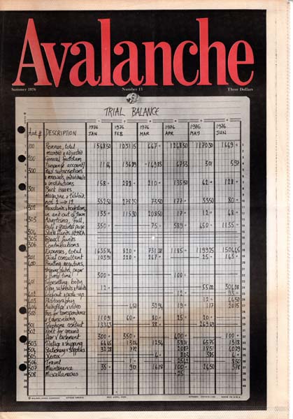 Avalanche. Avalanche 1, Fall 1970 – Avalanche 13, Summer 1976. Edited by Willioughby Sharp [and] Elizabeth Bear. First printing. 13 Hefte / 13 Volumes. New York. Kineticism Press. 1970-1976. 24 x 24 cm / 43,5 x 29,5 cm. OBroschur und OKarton. Insgesamt sehr gutes, frisches Exemplar. Vollständige Folge aller erschienenen Hefte des Avantgarde-Magazins, die ersten 8 Hefte (Avalanche) im Format 24 x 24 cm, die weiteren 5 folgenden Magazine (Avalanche Newspaper) im Zeitungsformat 43,5 x 29,5 cm. Avalanche gehörte, geführt und gegründet 1968 von Willoughby Sharp und Liza Béar, zu den bedeutendsten Kunst-Avantgarde-Zeitungen der 60er Jahre.
