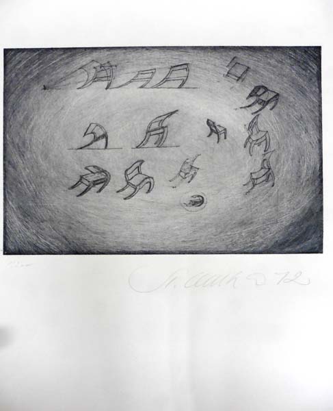 Wewerka, Stefan: Ohne Titel. [Radierung]. Im oberen Rand Druck- und leichte Knitterstellen, sonst gutes Exemplar. Originalradierung, 1972, unter dem Plattenrand recht signiert und datiert, links nummeriert 1 / 200 Exemplaren auf Büttenkarton. 77,5 x 64,5 cm.