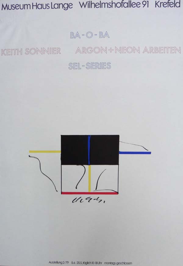 Sonnier, Keith: BA – O- BA SEL – Series. [Plakat] Argon + Neon Arbeiten. Museum Haus Lange, 8.4. – 20.5.1979. Krefeld. Museum haus Lange. 1979. 84 x 59 cm. 1 Blatt. Etwas randberieben. Deutliche Knitterspur am oberen linken Rand. Gutes Exemplar. Plakat, Offsetlithographie in Schwarz, Blau, Rot und Gelb auf Papier.