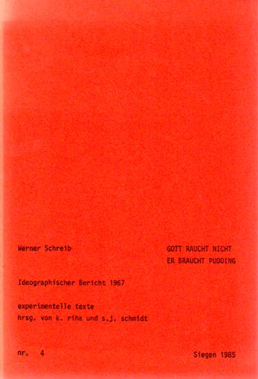 Schreib, Werner: Gott raucht nicht / Er braucht Pudding. Ideographischer Bericht 1967. 1. Auflage. Siegen. [experimentelle texte]. 1985. 21 x 15 cm. OKarton. Einband mit stärkerem Lichtrand, sonst gutes Exemplar. experimentelle texte, hrsg. von k. riha und s.j. schmidt ; nr. 4. Durchgehend mit Textarbeiten von Werner Schreib versehen sowie mit einem Beitrag von Karl Riha. Beiliegend: Information bezüglich der Deckung der Versandumkosten der Heftreihe „exp. texte“.
