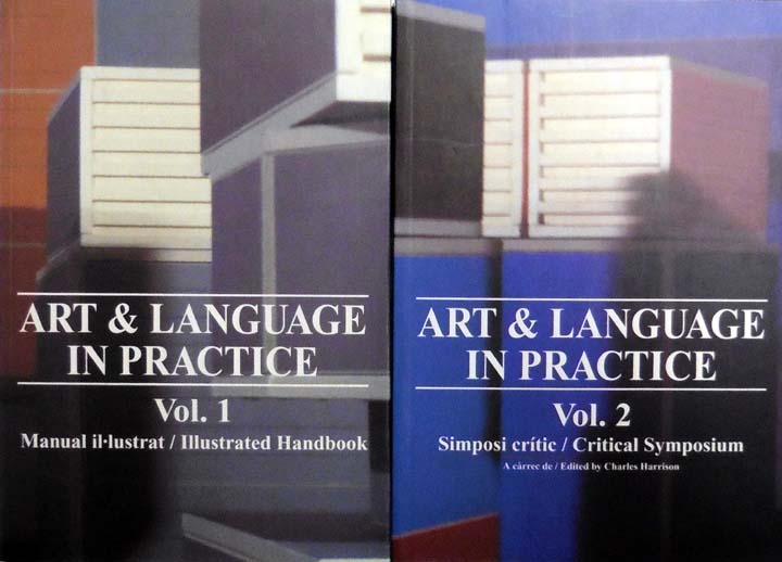 Art & Language: Art & Language in Practice. Vol. 1 – Manual il-lustrat / Illustrated Handbook. Michael Baldwin, Charles Harrison, Mel Ramsden. Vol. 2 – Simposi critic / Critical Symposium. A carrec de / Edited by Charles Harrison. 1. Auflage. 2 Bände. Barcelona. Fundacio Antoni Tapies. 1999. 24 x 17 cm. 300 S., 3-seitiges Faltblatt, 1 Blatt; 277 S. 2 OKarton mit Klappen. Als Mängelexemplar gekennzeichnet (Striche auf den Fußschnitten), Rücken stärker aufgehellt und minimal lesespurig, Kapitale berieben. Ordentliches Exemplar. Texte in Katalanisch und Englisch. Mit mehr als 100 Abbildungen, davon viele in Farbe. Erschien anläßlich der Ausstellung „Art & Language in Practice“, Fundacio Antoni Tapies, Barcelona, 16. April-27. Juni 1999.