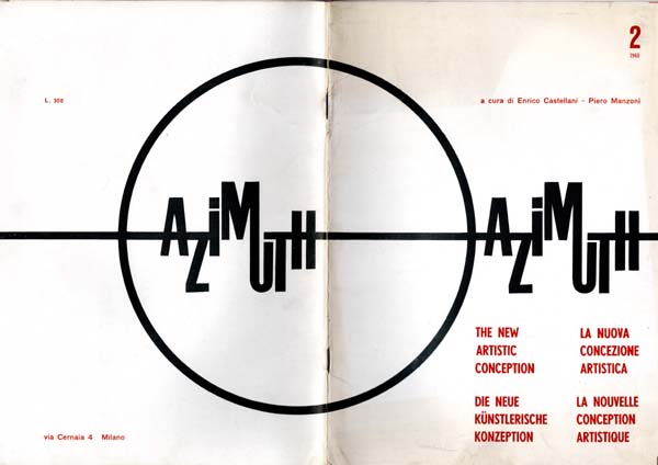 Azimuth 2. The New Artistic Conception / La nuova concezione artistica / Die neue künstlerische Konzeption / La nouvelle conception artistique. A cura di Enrico Castellani – Piero Manzoni. Milano, gennaio 1960. Dedicato a la nuova concezione artistica. Milano. E.P.I. editoriale periodici italiani. 1960. 30 x 21 cm. 24 unpaginierte S. OKarton. Umschlag an den Rändern leicht nachgedunkelt, etwas angestaubt und am Rücken etwas berieben und marginal knitterspurig. Gutes Exemplar. Heft 2 von nur 2 erschienenen Publikationen, heraugegeben von Enrico Castellani und Piero Manzoni. Mit einem Text von Otto Piene in Deutsch, Italienisch, Französisch und Englisch sowie abgebildeten Arbeiten von K. Breier, E. Castellani, Y. Klein, O. Holweck, H. Mack, P. Manzoni, A. Mavignier und O. Piene. Mittig eingebunden eine Einladung auf braunem Karton der Galerie Azimut für eine gleichnamige Ausstellung mit den im Heft vorgestellten Künstlern vom 4. Januar bis 1. Februar 1960.[Vgl. Gagosian Gallery. Manzoni Azimut. 2011, S. 127ff. Mit einem Faksimile der Hefte 1 und 2].