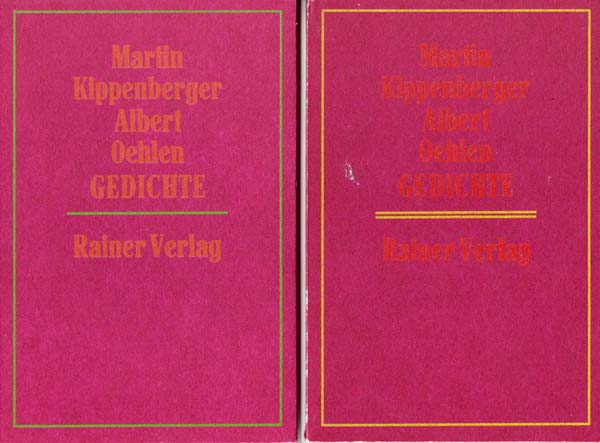 Oehlen, Albert [und] Martin Kippenberger: Gedichte [und] Gedichte Zweiter Teil. Erste Auflage. 2 Bände. Berlin. Rainer Verlag. 1984 / 1987. 15 x 10 cm. 69 S., 1 Blatt; 69 S. 2 Blatt. OKarton. Rückenkanten etwas berieben, sonst gutes Exemplar. Enthält 68 und 65 von Martin Kippenberger und Albert Oehlen verfasste Gedichte. [Vgl. Uwe Koch. Kommentiertes Werkverzeichnis der Bücher von Martin Kippenberger, Nr. 26 und 54].