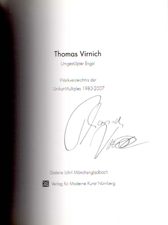 Virnich, Thomas: Umgestülpter Engel. Werkverzeichnis der Unikat-Multiples 1983-2007. Auflage: 1400 Exemplare. Mönchengladbach / Nürnberg. Skulpturengalerie Löhrl / Verlag für Moderne Kunst. 2007. 26 x 21 cm. 220 S., 2 Blatt. OKarton mit Klappen. Gutes bis sehr gutes Exemplar. 2-fach handschriftlich von Thomas Virnich signiertes Exemplar: Auf dem Titelblatt sowie über der Biografie auf Seite 213. Mit Texten von Stephan Kunz und Volker Rattemeyer. Verzeichnet 89 Arbeiten, alle farbig abgebildet. Erschien anlässlich der Ausstellungen: Aargauer Kunsthaus, Aarau, 4. Mai-22. Juli 2007; Museum Wiesbaden, Oktober 2007-Januar 2008; Skulpturenmuseum Glaskasten Marl, 2008; [und weitere Stationen].