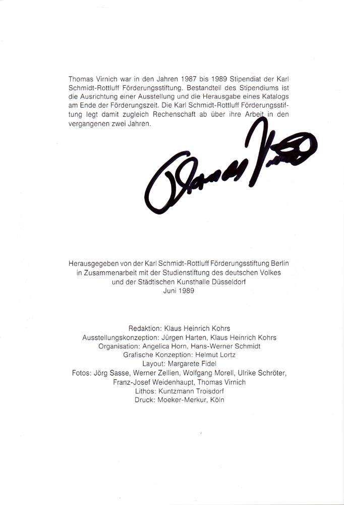 Virnich, Thomas: Karl Schmitt-Rottluf Stipendium. Städtische Kunsthalle Düsseldorf, 10. Juni bis 16. Juli 1989. 1. Auflage. Düsseldorf. Städtische Kunsthalle. 1989. 30 x 21 cm. 36 unpaginierte S. OKarton. Einband teilweise stärker berieben und teilweise mit Spuren von Farbe, Seiten teilweise mit Eselsohren. Ordentliches Exemplar. 2-fach signiertes Exemplar: Auf Seite 4 über dem Impressum und auf Seite 33 über biographischen Daten. Mit Textbeiträgen von Thomas Virnich, Ulrike Schröter und Klaus Heinrich Kohrs. Durchgehend mit Abbildungen versehen, teilweise in Farbe.