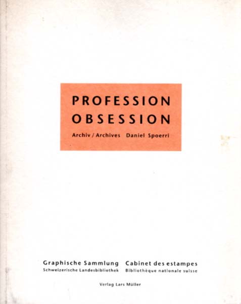 Spoerri, Daniel: Profession Obsession. Archiv / Archives Daniel Spoerri. Graphische Sammlung Schweizerische Landesbibliothek. Cabinet des estampes Bibliotheque natinale suisse. ohne Ort. Verlag Lars Müller. 1997. 23 x 17 cm. 76 S. 1 Blatt. OKarton. Einband minimal angestaubt. Sehr gutes Exemplar. Spoerri spendete 1996 sein gesamtes Archiv der Graphischen Sammlung, die Teile davon hier erstmals vorstellt. Gezeigt werden vor allem die seltenen Objekte ujnd Ephemera. Mit einigen farbigen Abbildungen. Von Daniel Spoerri auf dem Titelblatt handschriftlich signiert.