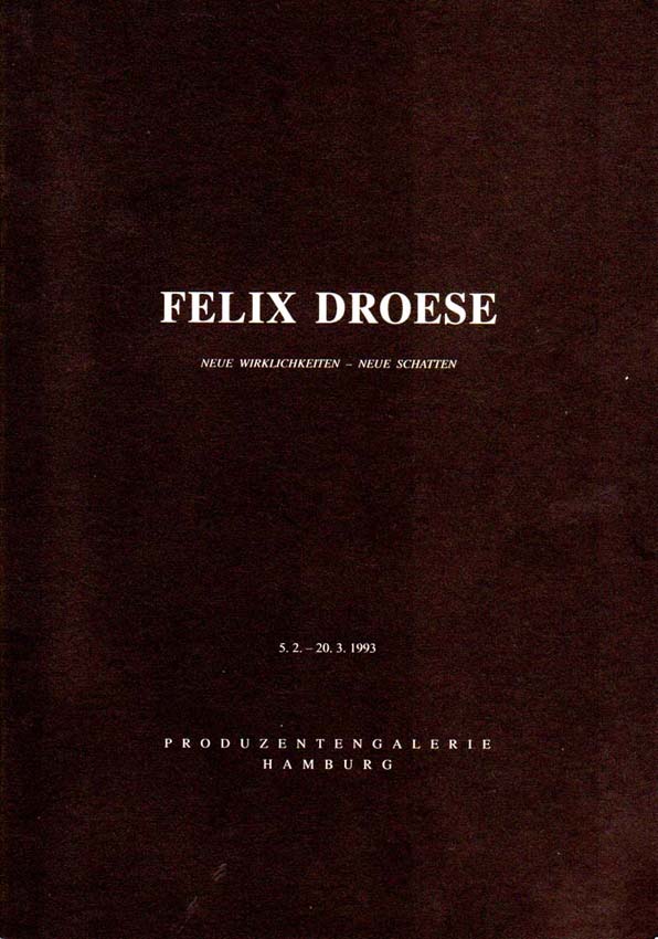 Droese, Felix: Neue Wirklichkeiten – Neue Schatten. Produzentengalerie Hamburg, 5.2.-20.3.1993. Auflage: 500 Exemplare. Hamburg. Produzentengalerie. 1993. 30 x 21 cm. 16 unpaginierte S. OKarton. Marginale Beriebungen am Einband. Gutes Exemplar. Mit 7 ganz- bzw. doppelseitigen schwarz-weiß Abbildungen.