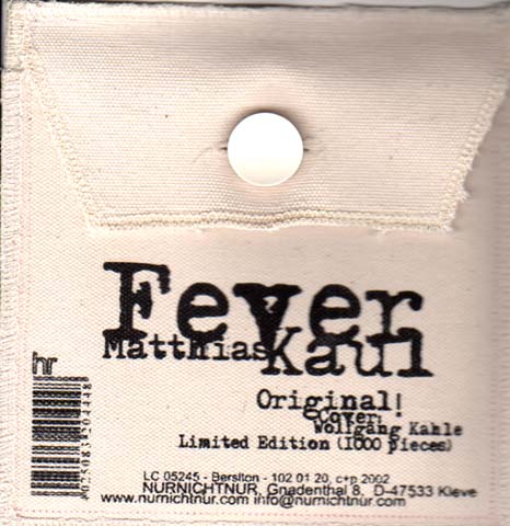Kaul, Matthias: Fever – Five Songs from a Percussionist. [Audio-CD]. Original! Cover: Wolfgang Kahle. Limited Edition: 1000 Exemplare. Kleve. NURNICHTNUR. 2002. Handgefertigte OLeinwand-Tasche mit OBeiblatt. Sehr gutes Exemplar (NM). Each composition of this CD is dedicated to a person, or to the work of a person: Malcolm Goldstein, Amadeu Antonio Kiowa, Ingeborg Bachmann, Elvis Presley and Yoko Tawada. Each handmade CD-bag is unique because it is part of a huge painting which has been cut into a thousand pieces. With the handwritten number and letter you can find somewhere on your CD-bag, you can figure out, which part of the painting you are holding in your hands (hier: Nummer 39, ohne Buchstabe).