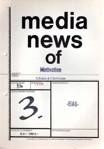 Franz, Christine & Timm Schröder: EIAG. motivation. media news [Heft] 3, 11-1970. Herausgegeben von Dietmar Kirves. Auflage 1/ 200 Exemplaren. Düsseldorf. Mediacontact Dietmar Kirves. 1970. 29 x 22 cm. 10 S.1 Blatt. Gehefteter Karton. Sehr gutes Exemplar. Hier nicht wie üblich von Christine Franz und Timm Schröder handschriftlich auf Titelblatt signiert sondern nur gestempelt „MOTIVATION“. Beinhaltet ein handschriftlich wiedergegebenen Manifest, eine Zeichnung, einen Ereignisplan und Kopien von Medienberichten. Offenbar Nachauflage, als Copy 9 / 20 bezeichnet.