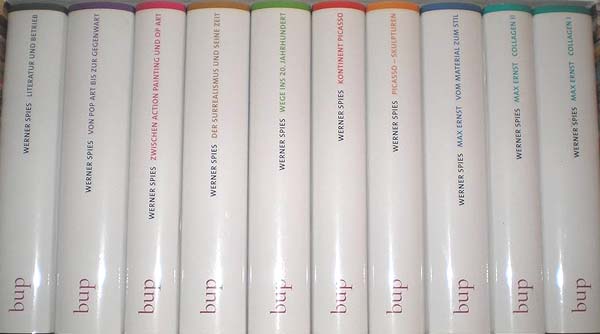 Spies, Werner: Auge und Wort. Gesammelte Schriften zu Kunst und Literatur. 1. Auflage. 10 Bände. Berlin: Berlin University Press. 2008. 40 x 23 x 14 cm. 459, 370, 464,412, 389, 449, 479, 377, 501, 438 S. OPappband mit OUmschlag in illustrierter OPapp-Kassette. Zei Umschläge am unteren Kapital minimal berieben, sonst sehr gutes und frisches Exemplar. Enhält: Max Ernst – Collagen 1 + 2; Max Ernst – Vom Material zu Stil; Picasso – Skulpturen; Kontinent Picasso; Wege ins 20. Jahrhundert; Der Surrealismus und seine Zeit; Zwischen Action Painting und Op Art; Von Pop Art bis zur Gegenwart; Literatur und Betrieb.