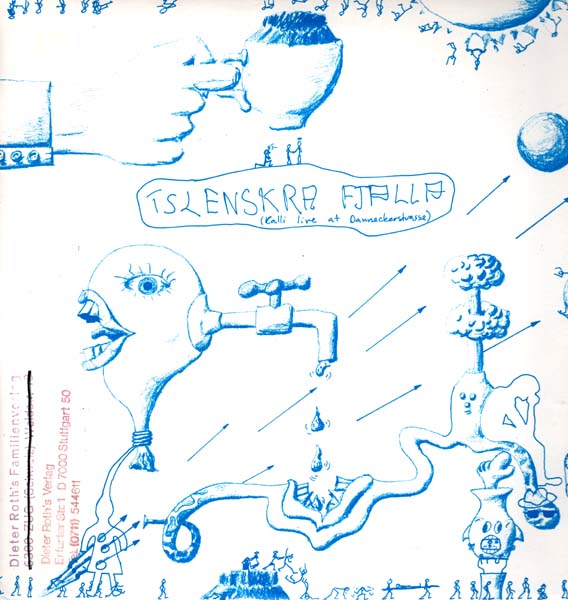 (Roth, Dieter) – Karl Roth Karlsson / Dieter Roth: Islenskra Fjalla. (Kalli live at Danneckerstrasse). Edition of 200 copies. Zug. Stuttgart. Dieter Roths [Familien]Verlag. 1975. 32,0 x 31,5 cm. OKarton-Cover. Sehr gutes, frisches. Cover near mint, Platte mint. Nummer 181 / 200 handschriftlich nummerierten und von Karl Roth Karlsson und Dieter Roth signierten Exemplaren (Karl Roth auf Klebeetikett, Dieter Roth auf Platte und halb auf dem Etikett). Auf dem vorderen Cover mit blauem Stempel „Dieter Roth´s Familienverlag Zug“ . Karl Roth Karlsson spielt Gitarre und singt dazu, sein Vater Dieter hört zu, spricht dazwischen oder klatscht ab und an. [Vgl. Dieter Roth und die Musik. Discography – Roth´s Verlag, S.154 mit Abbildungen].