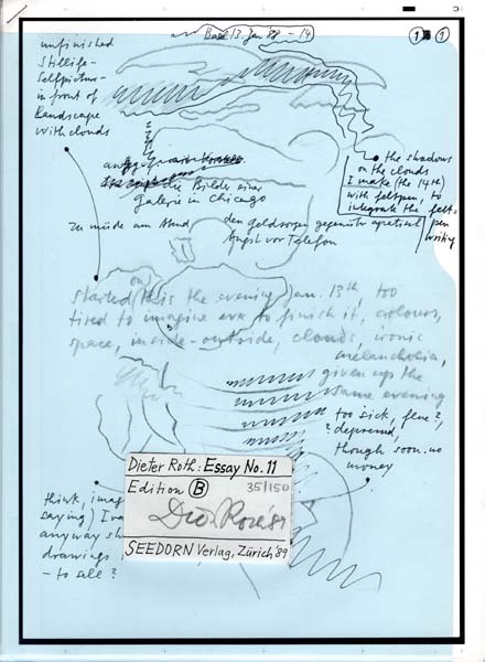 Roth, Dieter: Essay N° 11. Written 1988, published 1989. Auflage 150 + 75 Exemplare. Zürich. Seedorn Verlag. 1989. 37,5 x 29,5 cm OKarton-Kuvert. 26 Blatt, Klammerheftung. Sehr gutes Exemplar. Enthält 24 kopierte Blätter (32,0 x 23,5 cm) auf festem Papier sowie 2 Blätter DIN A 4 auf 80 Gramm Papier, Laserfarbkopien. Nummer 35 / 150 auf Etikett nummerierte und von Dieter Roth signierte Exemplare der Edition B. Es erschien ferner eine Edition A in 75 Exemplaren, eingewickelt in ein Faltposter. Beiliegend das Faltposter zu dieser Edition, allerdings nicht nummeriert und in den Maßen 136 x 100 cm (nicht wie angekündigt 130 x 90 cm=). Beiliegend ferner eine in Karton gebundene Variante der 24 Blatt, hier auf Andruckbögen gedruckt, unbeschnitten, ohne die beiden Laserkopien sowie 2 Bestellscheine in Deutsch und Englisch. [Vgl. Dirk Dobke: Dieter Roth – Bücher + Grafik. Catalogue Raisonne, S. 207, verzeichnet nur die unlimitierte Variante mit 24 Seiten, gebunden].