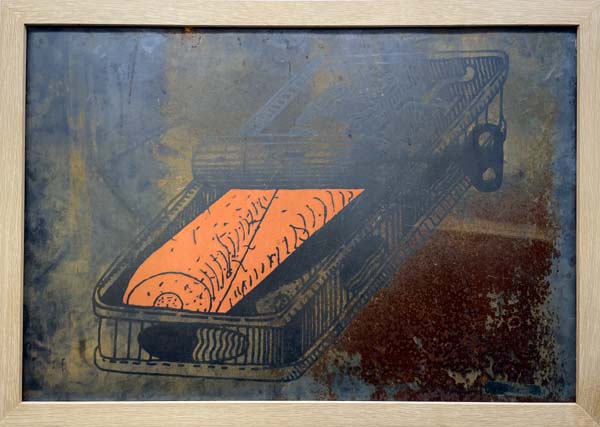 Roth, Dieter: Wurzelbehandlung. Düsseldorf. Hartmut Kaminski. 1971. Gutes bis sehr gutes Exemplar. Siebdruck, zwei Farben und Rost auf Aluminiumblech, in Holzrahmen gefasst. Beidseitig mit gleichem Motiv in unterschiedlichen stärken gedruckt nach einer photographischen Reproduktion einer Zeichnung. 63 x 91 cm, inklusive Rahmung 69 x 97 cm. Unten rechts handschriftlich von Dieter Roth signiert und datiert 1971. Eins von 50 Exemplaren, hier ohne Nummerierung. Die Arbeit war Bestandteil der Mappe „6 Düsseldorfer Künstler“. [Vgl. Dirk Dobke: Dieter Roth – Das graphische Werk. Catalogue Raisonne, S. 122, Nummer 163].