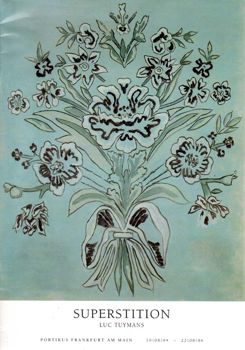 Tuymans, Luc: SUPERSTITION. PORTIKUS FRANKFURT AM MAIN, 19/08/94-22/08/94. 1. Auflage. Frankfurt. Portikus. 1994. 30 x 21 cm. 30 S., 1 Blatt. OBroschur. Oberer Rücken gering stauchspurig, sonst gutes Exemplar. Text von Robert Van Ruysevelt in Deutsch und Englisch. Mit 9 Abbildungen, davon 8 in Farbe.