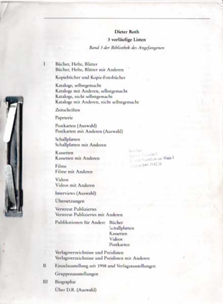 Roth, Dieter: 3 vorläufige Listen. Band 3 der Bibliothek des Angefangenen. Auflage 300 Exemplare. Basel. Dieter Roth´s Verlag. 1987. 23 x 17 cm. 108 S. Gelocht mit Metallschienenklammer, transparenter OUmschlag. Stempelrest „Portikus“ und leichte Radierspuren am Titelblatt, obere Kante am Rücken etwas gestaucht,. sont gutes Exemplar. Zusammengestellt von Barbara Wien für die Ausstellung „Publiziertes und Unpubliziertes“ im Portikus / Frankfurt unter Verwendung einer Bibliographie von Dieter Schwarz. Gesetzt auf weißem Papier und grünen und gelben Kartons. Bibliographisches Verzeichnis der Bücher, Kataloge, Zeitschriften, Schallplatten, Videos, Kassetten, Filme, Interviews, Übersetzungen, Verlagsverzeichnisse. [Vgl. Dirk Dobke: Dieter Roth – Bücher + Editionen. Catalogue Raisonne, S. 234].