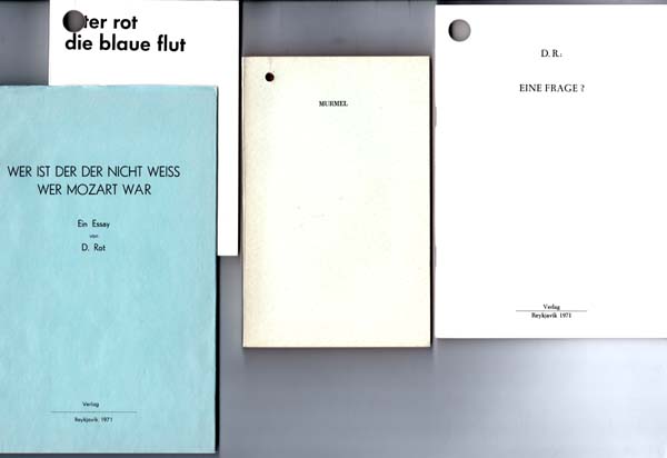 Roth, Dieter: Ausstellung „Bücher“ in der Kestner Gesellschaft 1974. 14 Bände. Alle Titel jeweils in den Originaleinbänden. Alle Bände oben links am Rücken gelocht. Zwei Bände mit Gebrauchspuren, sonst erstaunlich saubere uind wohlerhaltene Exemplare. Bei dem vorliegendem Konvolut handelt es sich um 14 jener Bände aus dem Werk Dieter Roths, die 1974 in der Ausstellung der Kestner Gesellschaft Hannover zur Verwendung kamen. In dieser Ausstellung, die sich ausschließlich mit den Büchern im Werk Dieter Roths auseinandersetzte, wurden – wohl erstmals in einer institutionellen Ausstellung – auf eine höchst unkonventionelle Weise der Präsentation, die Bücher an der oberen Ecke des Rückens mit einem Durchmesser von bis zu 1,5 cm gelocht, mit Ösen versehen und an Ketten von der Decke herab gehängt. Der Besucher hatte so die Möglichkeit, anders als bei einer Auslage in einer Vitrine, das Buch rundum zu betrachten und gegebenenfalls auch darin zu blättern. Jeweils 10 Exemplare eines Titels wurden so zum Studium oder einfach nur zur Betrachtung von der Decke gehängt. Der Verlag Hansjörg Mayer und Dieter Roth stellten die Bücher zur Verfügung. Es handelte sich insgesamt um 69 Bände aus dem Werk Roths, die zu diesem Zeitpunkt noch lieferbar waren und im Katalog der Kestner Gesellschaft annonciert wurden. In diesem Katalog sind auch alle ausgestellten Objekte mit genauen Notationen versehen, wodurch die Ausstellungsstücke noch einmal belegt sind . (Der Katalog liegt – ungelocht – als Belegexemplar dem Konvolut bei). Vorhanden sind die Bände: (1) Eine Frage. Reykjavik 1971, Nummer 107 / 200 nummerierten und signierten Exemplaren; (2) Wer war Mozart? Reykjavik 1971, Nummer 147 / 200 nummerierten und signierten Exemplaren; (3) Wer ist der der nicht weiss wer Mozart war. Reykjavik 1971, Nummer 150 / 200 nummerierten und signierten Exemplaren; (4) 2 Probleme unserer Zeit. Reykjavik 1971, Nummer 66 / 200 nummerierten und signierten Exemplaren; (5) Ein Essay. Reykjavik 1972, Nummer 75 / 200 nummerierten und signierten Exemplaren; (6) Franz Eggenschwiler. Ein Essay. Edition Hans Jörg Mayer 1971; (7) Murmel. (Exemplar ohne Kolophon); (8) Das Tränenmeer. Dieter Roth 1973, Nummer 62 / 200 nummerierten und signierten Exemplaren; (9) Das Tränenmeer. Band 2. Dieter Roth 1974, Nummer 135 / 200 nummerierten und signierte Exemplaren. (10) Die Blaue Flut. Edition Hansjörg Mayer, 1967. Nummer 300 von 500 nummerierten Exemplaren; (11) 246 little clouds. Something Else Presse, 1968; (12) Die DIE GESAMTE SCHEISSE. Edition Hansjörg Mayer, 1973. Nummer 398 / 400 handschriftlich nummerierten und signierten Exemplaren; (13) Noch mehr Scheisse. Eine Nachlese. Edition H.J.Mayer, 1968. Handschriftlich von Dieter Roth vermerkt „Archiv Copy“ und signiert, datiert 1972; (14) Die Schastrommel Nummer 9. Gestaltet von Dieter Roth. Mit zwei Faltbeilagen. Von den 14 Ausgaben sind 9 handschriftlich von Dieter Roth signirert. Mit Ketten und Kabelbinder als Ösen. Heute wohl einmalies Ensemble aus dieser Ausstellung. [Vgl. Dieter Roth. Bücher. Kestner Gesellschaft Hannover, 10. Mai – 30. Juni 1974].
