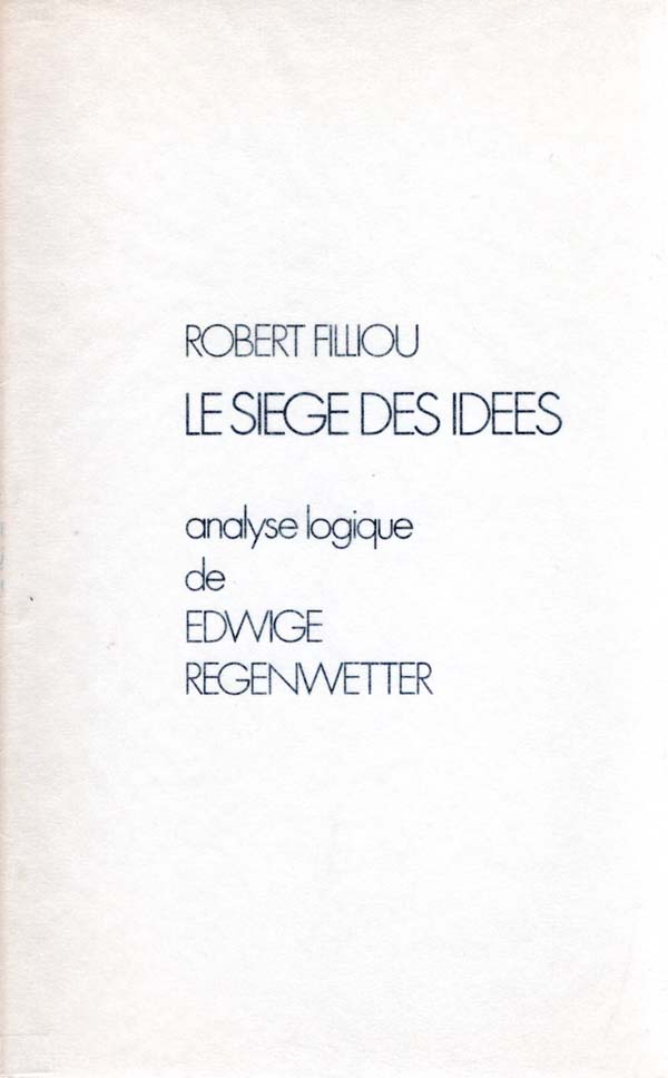 Filliou, Robert: Le siege des idees. Analyde logique de EWIGE REGENWETTER. Bruxelles. Editions Lebeer Hossmann. 1977. 21 x 13 cm. 27 S., 1 Blatt. OKarton. Sehr gutes Exemplar. Nummer 539 / 900 handschriftlich im Kolophon nummerierten Exemplaren. [Vgl. Robert Filliou. editions & multiples, 2003, Nummer 72].