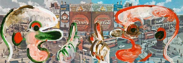 Roth, Dieter: 96 Piccadillies. Übermalung des Umschlages für Band 36 der Gesammelten Werke. Übermalung des Umschlages für Band 36 der Gesammelten Werke, „96 Piccadillies“ von Dieter Roth als Vorzugsausgabe. Nummer 150 von 200 Exemplaren, Öl auf Offsetdruck (zwei Köpfe zeigen auf die Coca-Cola Werbung am Piccadilly Circus), handschriftlich nummeriert und signiert rechts im Blatt. 24 x 69 cm, gerahmt in silberner Metallleiste unter Glas, 40 x 84 cm. Alle Motive sind unterschiedlich. Provenienz: Durch den Vorbesitzer 2017 bei Van Ham erworben. [Vgl. Dobke. Roth – Bücher + Editionen S. 211 mit Abbildung einer Variante].