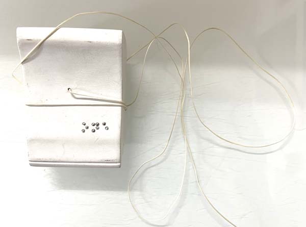 Knowles, Alison: Cornerpiece. Köln. Edition Hundertmark. (1988). 9 x 6 x 3 cm. Sehr gutes Exemplar. 118. Edition Box Edition Hundertmark. Multiple; Holz und Papier, Kordel. Eckstück einer Rahmenleiste, geschnitten und weiß lackiert, an einer 130 cm langen Schnur. Seitlich mit kleinen silbernen Nägeln in Brailelschrift benagelt. Mit einem bedruckten Etikett, darauf handschriftlich signiert und nummeriert 4 / 25 Exemplare. Jedes der 25 „Cornerpieces“ ist unterschiedlich gestaltet.