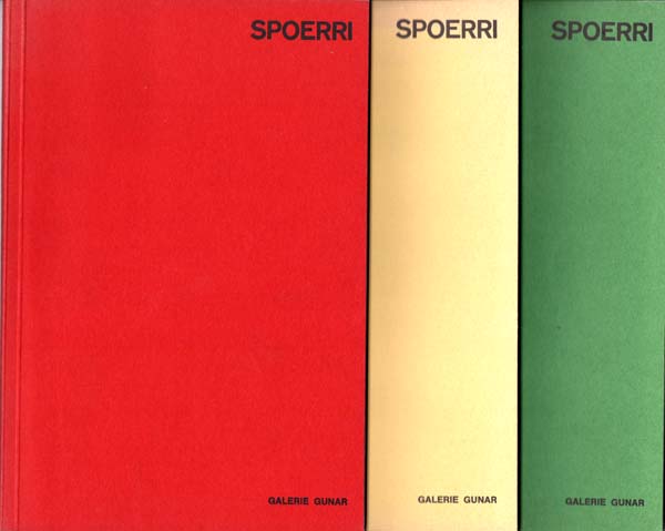 Spoerri, Daniel: 25 objets de magie a la noix. Zimtzauberkonserven. Deutsch von Andre Thomkins. (Ausstellung in der) Galerie Gunar Düsseldorf vom 17. Mai – 13. Juni 1968. Düsseldorf. Galerie Gunar. 1968. 25 x 17 cm. 45; 31 S. OKarton. Einbandvarianten in grünem, gelbem und rotem Karton. Der rote Band mit kleinem Exlibris auf dem Innendeckel, sonst sehr gutes Exemplar. Erste Ausgabe. Ausstellungskatalog, erschienen in 800 Exemplaren. Gezeigt und beschrieben werden 25 archäologische Objekte von Daniel Spoerri, mit Texten illustriert von Andre Thomkins. Hier die Variante mit Deutschem und Französischem Text in drei Exemplaren mit den jeweiligen Einbänden in Gelb, Rot und Grün. Der rote und der grüne Band jeweils auf dem Vorsatz handschriftlich von Daniel Spoerri signiert, datiert mit dem Eröffnungstag der Ausstellung am 17.5.1968. Der Gelbe Band nicht signiert.