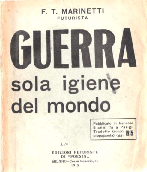 Marinetti, F[ilippo] T[ommaso]: Guerra sola igiene del mondo. Prima edizione. Milano. Edizione Futuriste di „Poesia“. 1915. 20 x 17 cm. 157 S., 3 Blatt. OBroschur. Umschlag am Rücken restauriert, dieser stilecht ersetzt. Obere Blattkante durchgehend minimal aufgewellt, eine kleine Markierung am Textrand S. 38. Sonst gutes Exemplar. (Einband durch Pergaminumschlag geschützt). Erste italienische Ausgabe, zuerst erschienen in Französisch 1909 in Paris. Sogenannte Propagandaausgabe im zweiten Jahr des Ersten Weltkrieges. Text in Italienisch.