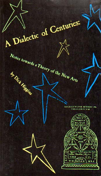 Higgins, Dick: A Dialectic of Centuries. Notes Towards a Theory of the New Arts. First printing , August 1978. New York & Barton, Vermont. Printed Editions. 1978. 24 x 14 S. 166 S., 7 Blatt. OLeinen mit OUmschlag. OUmschlag am oberen und unteren Steg etwas berieben und minimal läsiert, ein kleiner sauber hinterlegter Einriss. Sonst gutes Exemplar. Erste Ausgabe. Text in Englisch. Auf dem Zwischentitel handschriftlich von Dick Higgins in Kugelschreiber signiert.