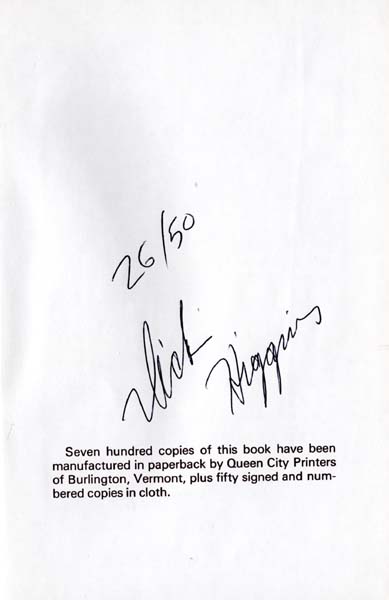 Higgins, Dick: Legends & Fishnets. First printing. New York. Unpublished Editions – Barton, Vermont & New York, 1976. 21 x 14 cm. 107 S., 2 Blatt. Auberginfarbenes OLeinen mit goldenem Rückentitel. Sehr gutes Exemplar. Mit in den Text gestreuten Fahrradillustrationen aus Magazinen der Jahrhundertwende um 1900. Text in Englisch. Vorzusausgabe, Nummer 26 / 50 handschriftlich im Kolophon nummerierten und signierten Exemplaren der gebundenen Ausgabe auf besserem Papier und etwas größer im Format. Es erschienen ferner 700 Exemplare kartoniert.