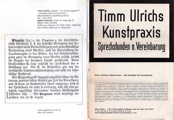 Ulrichs, Timm: Timm Ulrichs Kunstpraxis – Sprechstunden n. Vereinbarung.. Ohne Ort Selbstverlag Timm Ulrichs. 1967 – 1969. 29 x 21 cm. Leichte Gebrauch und Altersspuren. Gutes Exemplar. Zusammenstellung von Einladungsfaltblättern aus den Jahren 1967 bis 1969 durch den Künstler, klammergeheftet. Vorhanden sind drei Lagen á 8 Blatt, 4 Blatt und 4 Blatt. Beworben werden Ausstellungen oder Aktionen in den Galerien Kümmel, Köln; Galerie patio, Frankfurtg; Zimmergalerie, Hannover; edition h, Hannover etc. Die Blätter wiederholen sich teils. Dabei eine Einladung der Galerien Kümmel als Faltblatt, „timm ulrichs, plagiiert – timm ulrichs plagiiert?“ sowie zwei Karten von Timm Ulrichs.