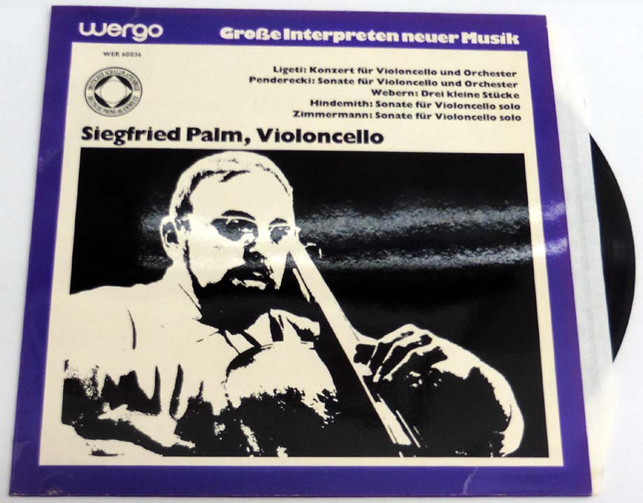 Palm, Siegfried: Siegfried Palm, Violoncello. Ligeti: Konzert Für Violoncello Und Orchester. Penderecki: Sonate Für Violoncello Und Orchester. Webern: Drei Kleine Stücke. Hindemith: Sonate Für Violoncello solo. Zimmermann: Sonate Für Violoncello solo. [Schallplatte / Vinyl Record]. Mainz. Wergo Schallplatten GmbH. 31,5 x 31,5 cm. OSchallplatte. OKarton-Cover. Cover minimal gebrauchsspurig (Very Good+), Schallplatte in sehr gutem Zustand (Near Mint). Insgesamt gutes bis sehr gutes Exemplar. WERGO – WER 60036.