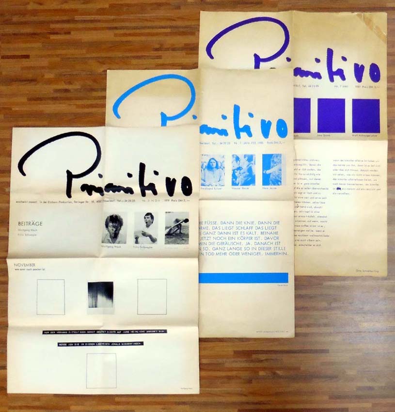 Primitivo. Nr. 5 NOV 1979; Nr. 7 JAN-FEB 1980; Nr. 7 MAI 1981. 3 Ausgaben. Düsseldorf. Einhorn-Production. 1979-1981. 66 x 48 cm. 3 x 1 Bogen. 3 gefaltete OZeitungen (Softcover). Papier insgesamt nachgedunkelt, kleine Anstreichung bei Ausgabe „NOV 1979“, Abriss (mit Tesa von fremder Hand wieder zusammengeklebt) bei Ausgabe „MAI 1981“. Insgesamt ordentliches Exemplar. 3 Ausgaben der Künstlerzeitschrift Primitivo. Mit Beiträgen von Wolfgang Weck, Fritz Schwegler, Ferdinand Kriwet, Hans Jeuze, Werner Blauer, Otto Schreiberling, Jens Quark, Arno Anonym, Wolf Achzigerjahre.
