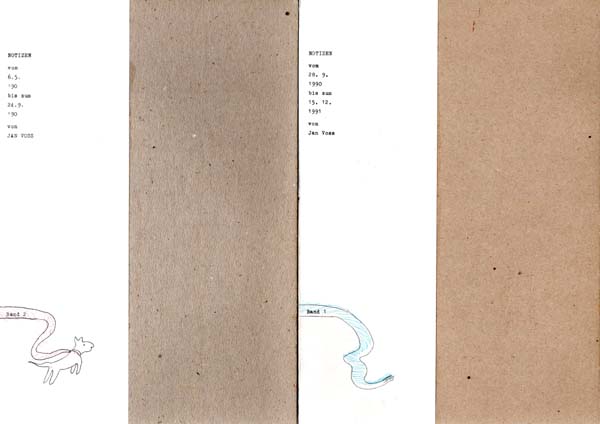 Voss, Jan: Notizen. Band 1 vom 28.9.1990 bis zum 15.12.1991 [und] Band 2 vom 6.5.1990 bis zum 24.9.1990. Auflage: 111 Exemplare. 2 Bände. Amsterdam. Selbstverlag Jan Voss. 1992 / 1993. 30 x 20 cm. 360; 360 S. OPappband, gelumbeckt. Sehr gutes, frisches Exemplar. Jeweils in 111 Exemplaren erschienen, im Impressum nummerieriert und signiert. Band 1 Exemplar 94 / 111, Band 2 Nummer 72 / 111. Durchgehend mit schwarz-weiß Illustrationen versehen.