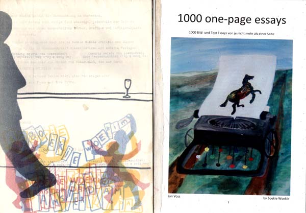 Voss, Jan: 1000 one – page essays. 1000 Bild- und Text Essay von je nicht mehr als einer Seite. Amsterdam. Boekie Woekie. 2016 (2017). 30 x 21 cm. OBroschur, Struckturbindung. Sehr gutes Exemplar. Copybook, durchgehend mit meist farbigen Abbildungen versehen. Unlimitiertes Unikatbuch, das nach Bedarf fortgeführt oder verändert wurde. Hier ein Exemplar als Geschenk von Jan Voss an den Vorbesitzer, mit beiliegender Postkarte (9 Zeilen handschriftlicher Text, signiert, datiert Amsterdam 8.8.2017). Das Buch im Kolophon ebenfalls datiert 27.7.2017 (16), signiert. Dabei: Almost one year later. Boekie Woeki Book. 60 Blatt, von Jan Voss mit „Je Seite 1 DM“ ausgepreist.