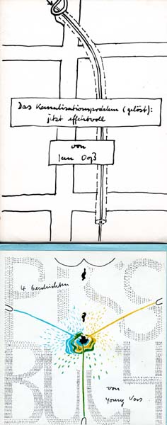 Voss, Jan: Das Kanalisationsproblem (gelöst): jetzt effektvoll. Auflage: 150 Exemplare. Ohne Ort. Selbstverlag Jan Voss. 1969. 20 x 14 cm. 9 unpaginierte Tafeln. OKarton. Sehr gutes Exemplar. Numer 71 / 150 signierten und nummerierten Exemplaren, datiert 1969. Durchgehend mit schwarz-weiß Abbildungen versehen. Gibt die Dritte Geschichte wieder. Dabei: 4 Geschichten von Young Voss. Zweiter Druck der 3. Geschichte. Aiflage 300 Exemplare, Düsseldorf 1971. Enthält die Wiedergabe der 1. bis 4. Geschichte, wovon die erste „Dürer und Ich“ ist, die zweite „mörgens bis abend“, die 3. das Kanalisationsproblem und die 4. das „Kanalisationsproblemlösungsbuch“.