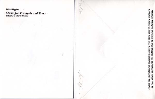 Higgins, Dick: Music for Trumpets and Trees. Dedicated to Charlie Morrow. First printing in 150 copies. Firenze. Lugo. Exempla & Exit. 1993. 21,2 x 27,6 cm. 6 Blatt, 1 Doppelbogen. OKuvert. Sehr gutes Exemplar. 3 Blatt Doppelbögen Siebdruck-Grafiken und ein erläuternder Text von Dick Higgins in Englisch und Italienisch, in bedrucktem Briefkuvert, verso handschriftlich nummeriert 92 / 150, signiert.