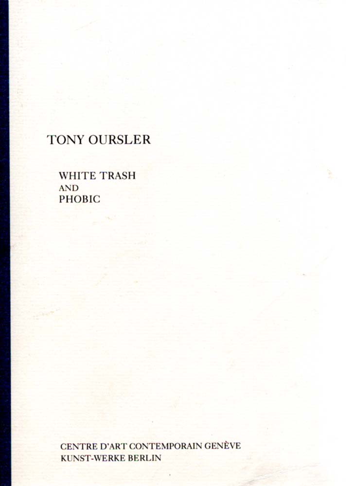 Oursler, Tony: WHITE TRASH AND PHOBIC. INTRODUCTION Elizabeth Janus. [Centre d’Art Contemporain Geneve, 14 mai-27 juin 1993; Kunst-Werke Berlin- Institut für Zeitgenössische Kunst und Theorie, 12 octobre-26 octobre 1993]. Auflage: 600 Exemplare. Centre d’Art Contemporain Geneve. 1993. 21 x 15 cm. 41 S., 1 Blatt. OKarton mit Klappen. Einband angestaubt, sonst gutes Exemplar. Texte in Englisch. Enthält 4 farbige Abbildungen.