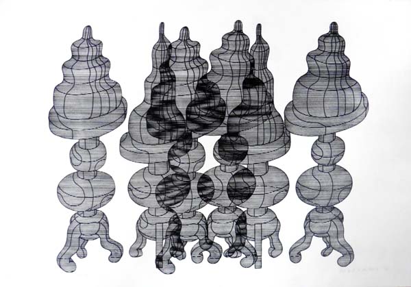 Roth, Dieter: Drei Kuchen auf Drehstühlen. 1 Blatt. Tadellos frisches Exemplar. Siebdruck, Schwarz auf weißem Schoeller Karton, mit Blindprägestempel, 51 x 73 cm. Nummer 74 / 100 nummerierten Exemplaren, unten rechts signiert und datiert 1970. Gedruckt von Hartmut Kaminski, Düsseldorf, für die edition tangente, Heidelberg. Durch die übereinanderliegende Drucktechnik ist jedes Exemplar ein Unikat. [Vgl. Dirk Dobke. Grafische Werke. Catalogue Raisonne. S. 120, Nummer 169].