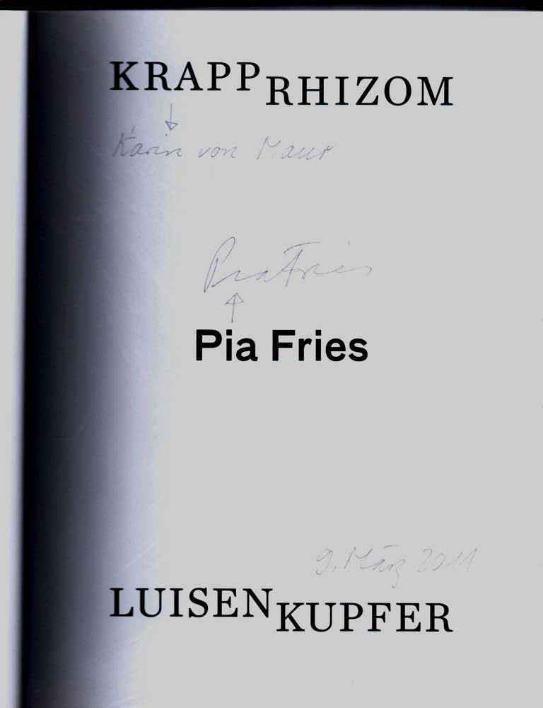 Fries, Pia: KRAPPRHIZOM LUISENKUPFER. Herausgegeben von der Staatlichen Kunsthalle Karlsruhe. Mit Texten von Oskar Bätschmann, Regine Heß, Pia Müller-Tamm, Astrid Reuter, Dorit Schäfer. [Staatliche Kunsthalle Karlsruhe, 18. Dezember 2010-27. März 2011]. 1. Auflage. Düsseldorf. Richter Verlag. 2010. 29 x 22 cm. 208 S. OPappband mit illustriertem OUmschlag. Einbandkanten minimal berieben. Sonst gutes bis sehr gutes Exemplar. Durchgehend mit meist farbigen Abbildungen versehen.