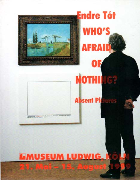 Tót, Endre: Who’s Afraid of Nothing? Absent Pictures 1. Auflage. Köln. Museum Ludwig. 1999. 27 x 22 cm. 168 Seiten. OBroschur. Einband leicht berieben, sonst gutes Exemplar. Erschienen anlässlich der gleichnamigen Ausstellung im Museum Ludwig, Köln. 21. Mai – 15. August 1999 & Museum of Contemporary Art – Ludwig Museum, Budapest. 28. Oktober – 5. Dezember 1999. Herausgegeben von Alfred M. Fischer. Durchgehend mit meist farbigen Abbildungen versehen. Texte in Deutsch und Englisch.