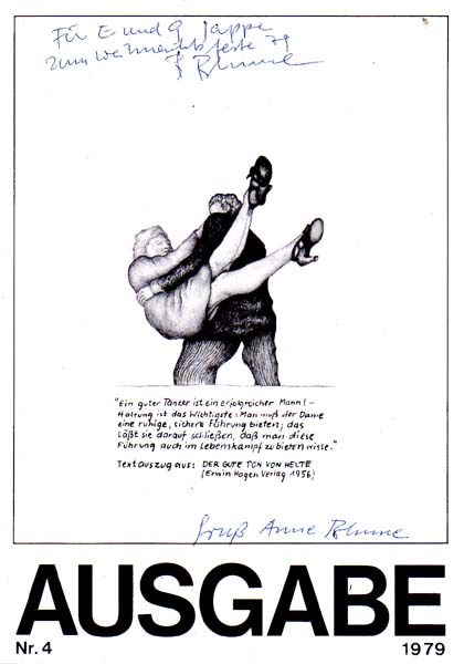 (Blume, Berhard und Anna) – Armin Hundertmark [Herausgeber]: AUSGABE Nr. 4 Mai 1979. Erste Auflage. Berlin. AUSGABE-Verlag. 1979. 21 x 15 cm. 122 S. Illustrierter OKarton. Mit minimalen Bereibungen am Einband und kleinen Flecken am oberen Buchschnitt. Sonst gutes Exemplar. Literatur- und Kunstmagazin, welches drei bis viermal pro Jahr erschien. Ausgabenr. 4 von Mai 1979, u.a. mit Christian Luttwig Attersee, Bernhard Johannes Blume, Claus Böhmler, Günter Brus, Ludwig Gosewitz, uvw. Durchgehend mit schwarz-weiß Abbildungen versehen. Texte in Deutsch und Englisch. Mit einer handschriftlichen Widmung von Bernhard und Anne Blume auf dem Umschlag für E. und G. Jappe, von beiden signiert.