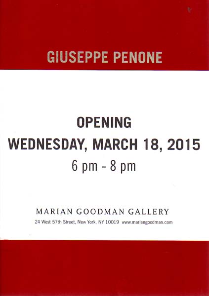 Penone, Giuseppe: Indistiniti confini. Marian Goodman Gallery, New York. March 15 – April 25, 2015. Erste Auflage. New York. Marian Goodman Gallery. 2015. 21 x 15 cm. 16 unpaginierte S. OBroschur mit OUmschlag. Sehr gutes Exemplar. Erschienen anlässlich der Ausstellungseröffnung der Marian Goodman Gallery in New York am Mittwoch, dem 18. März 2015. Mit teils farbigen Abbildungen versehen. Text in Englisch.