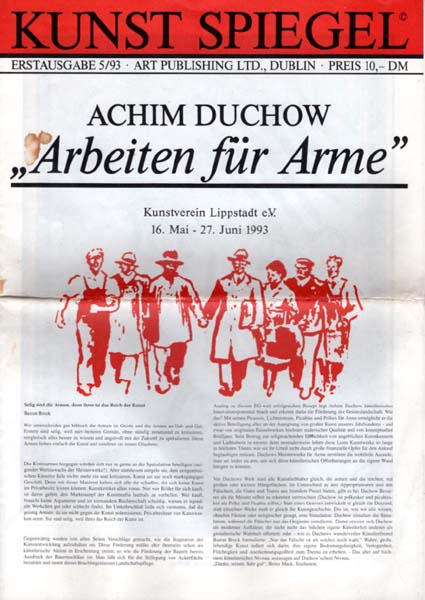 Duchow, Achim: Arbeiten für Arme. Auflage 1000 Exemplare. Lippstadt. Dublin. Kunstverein Lippstadt / Art Publishing Ltd, Dublin. 1993. 42,0 x 29,5 cm. 16 unpaginierte S. OBroschur im Zeitungsformat. Ein mal gefaltet, mit deutlicher Knickfalte. Titelseite mit Kaffefleck. Insgesamt gutes Exemplar. Ausstellungskatalog in Form einer Tageszeitung. Kunstverein Lippstadt, 16. Mai – 27. Juni 1993. Mit Texten von Bazon Brock und Tayfun Belgin sowie 30 farbig abgebildeten Arbeiten. Die „Arbeiten für Arme“ bieten auf höchstem Niveau für jeden kleinen Geldbeutel etwas: Picasso, Christo, Polke, Warhol, Francis, Lichtenstein, Rückriem, Beuys, Dix, Picabia etc. Letzte zu Lebzeiten des Künstlers geplante Ausstellung, Duchow starb 1993 in Düsseldorf.