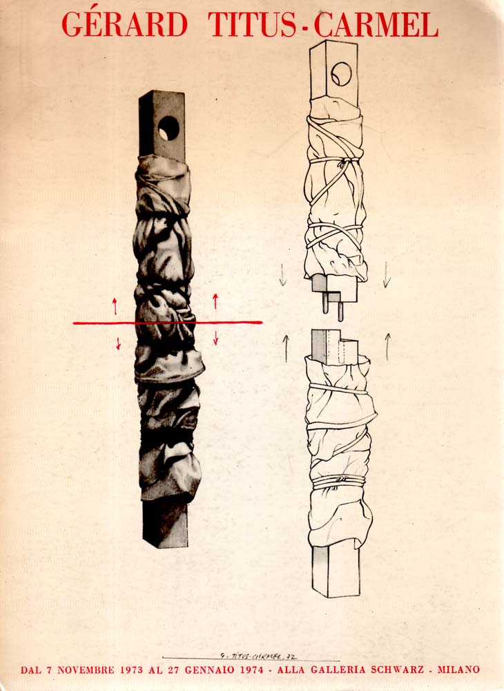 Titus-Carmel, Gerard: La strategia del disegno / La Stategie du dessin / The Strategy of Drawing. [Einladungskarte / Invitation Card] GALLERIA SCHWARZ – MILANO, DAL 7 NOVEMBRE 1973 AL 27 GENNAIO 1974. Milano. Galleria Schwarz. 1974. 29 x 21 cm. OKarton-Klappkarte. Karte insgesamt stärker nachgedunkelt und an den Kanten teilweise leicht stauchspurig. Noch gutes Exemplar. Einladungskarte.