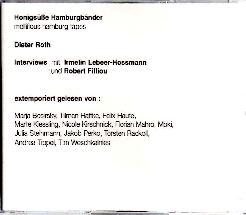 Roth, Dieter: Honigsüße Hamburgbänder. melliflous hamburg tapes. Interviews mit Irmelin Lebeer-Hossmann und Robert Filliou. extemporiert gelesen von: Marja Besirsky, Tilman Haffke, Felix Haufe, Marte Kiessling, Nicole Kirschnick, Florian Mahro, Moki, Julia Steinmann, Jakob Perko, Torsten Rackoll, Andrea Tippel, Tim Weschkalnies. Auflage: 70 nummerierte Exemplare. Basel / Reykjavik. Roth’s Verlag. 2005. 12,5 x 14 cm. 6 CD’s in OKunststoffhülle. Sehr gutes Exemplar. Handschriftlich nummeriertes Exemplar, hier die Nummer 63/70. Die CD’s wurden per Hand von Andrea Tippel und Studenten gestaltet.